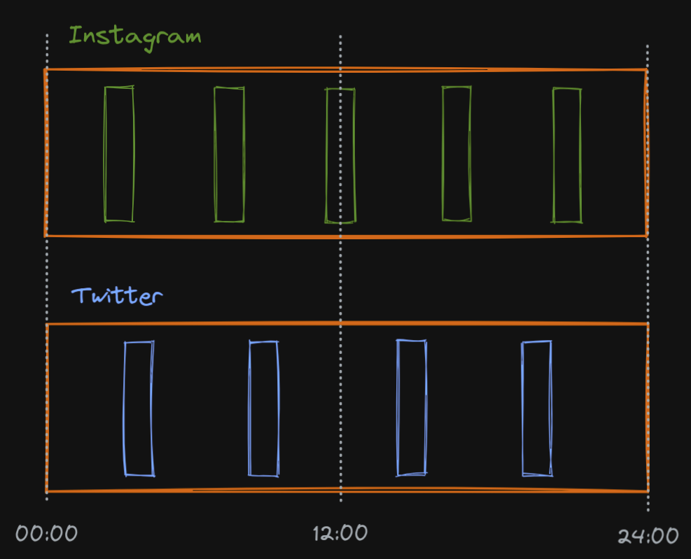 That day’s worth of pending requests need to be grouped by their provider type —think Instagram, Twitter, etc.— and scheduled in an evenly-spaced manner using a linear interpolation between NOW() and NOW() + 24 hours